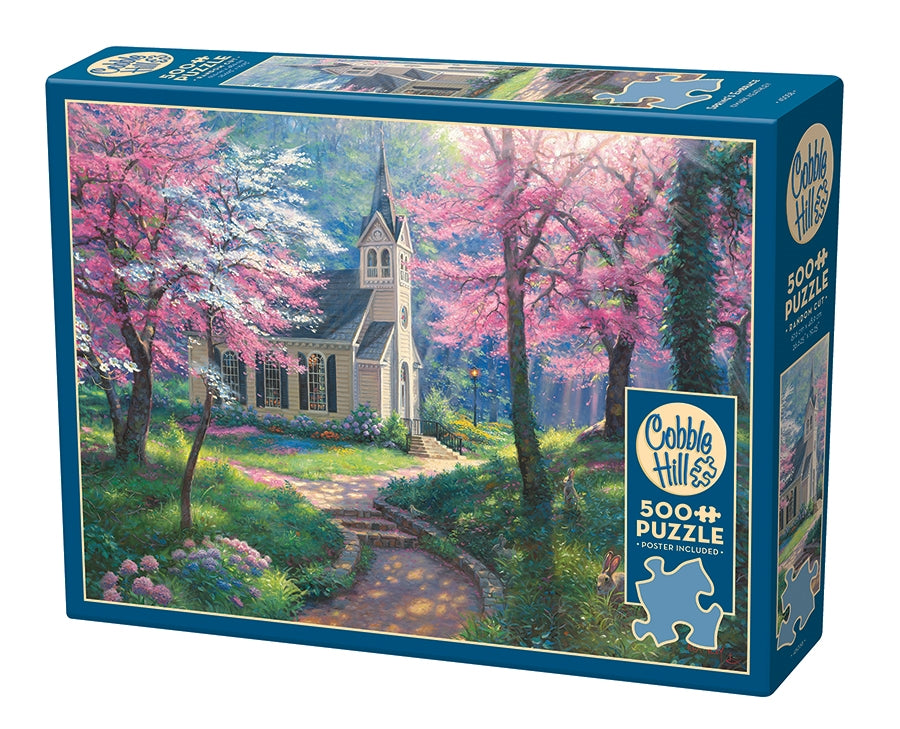 Cobble Hill - It looks like Spring's Embrace has taken place along the path to the church. The blossom of the trees adds to the beauty and tranquility of this forest church setting. A 500 piece joy of nature!