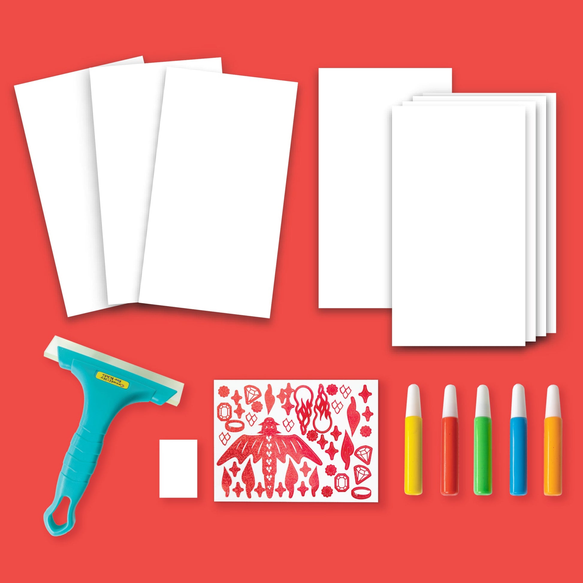 Contents Include: 1 Squeegee tool, 3 Hidden image designs, 5 Tubes of acrylic paint 10ml each, 4 Pieces of cardstock, 1 Foil sticker sheet, 1 Practice paper pad 10 sheets, 1 Sticky tack sheet and Instructions