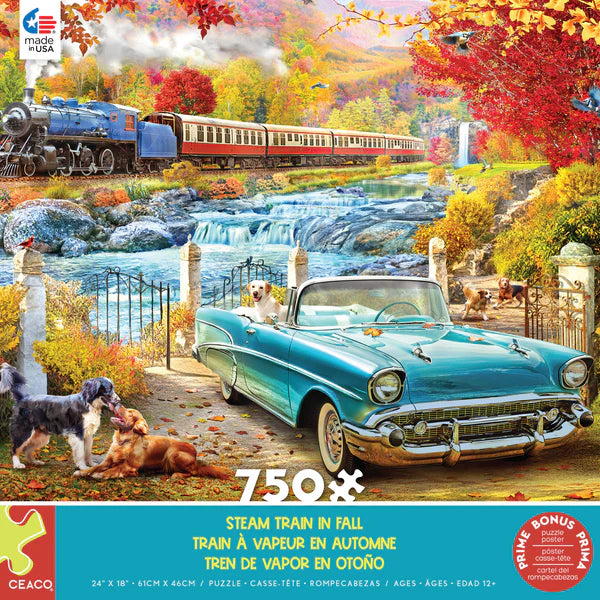 Ceaco - This 750 piece puzzle, titled "Steam Train in Fall", features a baby blue classic convertible in the foreground and a passenger train passing in front of a rushing river in the bsckground. A pair of dogs are playing next to the car, and the trees all around are displaying exquisite fall foliage. A bonus poster is included. Count on Ceaco for the most Creative, Exciting, and Colorful puzzles since 1987.