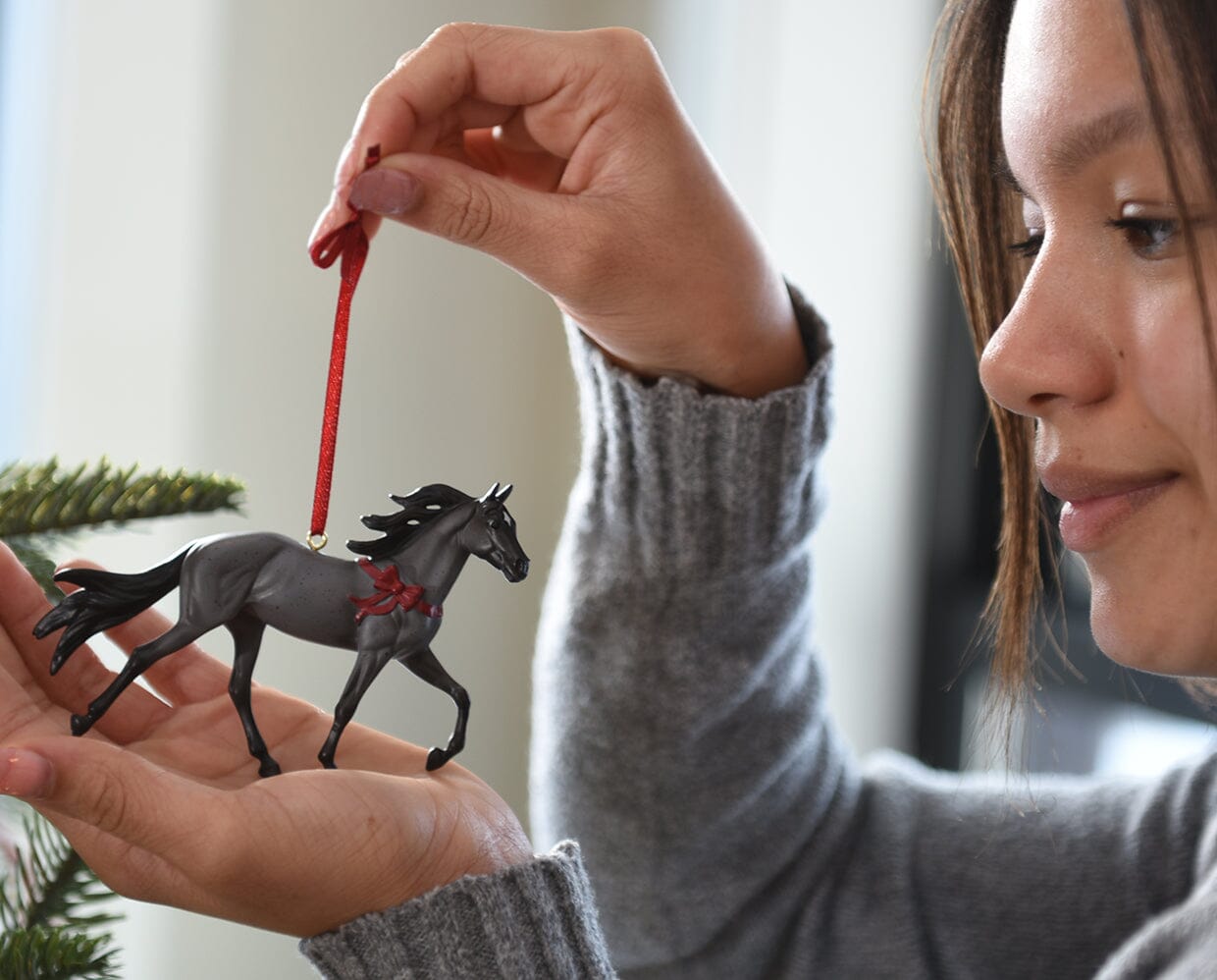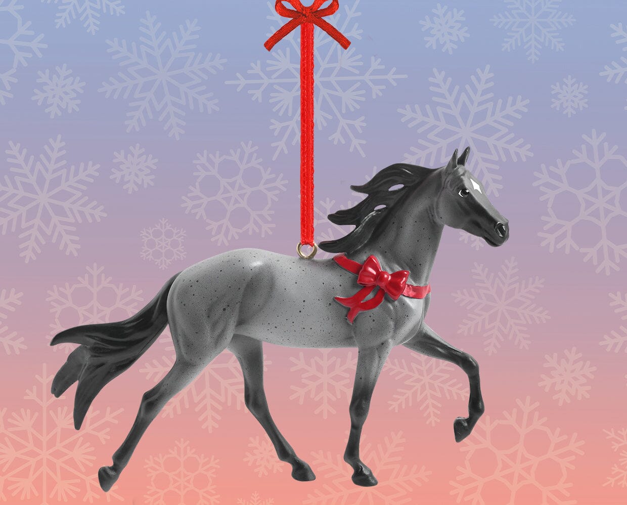 Designed by artist Sommer Prosser, this ornament celebrates a beloved American breed: the Tennessee Walking Horse. Best known for their smooth “running walk” which has made them a favorite amongst trail riding enthusiasts, they were originally bred for light farm work and driving, in addition to riding. This striking blue roan mare is outfitted for the holiday with a beautiful red ribbon.
