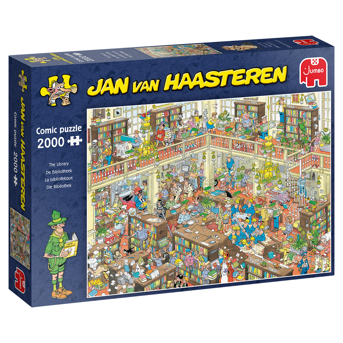 Jumbo - The Jan van Haasteren family spends the morning in the library, quietly looking for some new reading material. But it is anything but quiet here! There are some remarkable visitors who are clearly unaware of the library rules. A Jan van Haasteren puzzle is so much more than just a puzzle, it’s an adventure series with familiar characters playing the lead roles in a never-ending decor full of absurd details. Discover the crazy adventures of the Jan van Haasteren family! We are proud our puzzles are made from recycled cardboard in Europe. To cut the cardboard in puzzle pieces, we use the thinnest knife available. The puzzle has an almost seamless look when finished. Enjoy this Jan van Haasteren puzzle!