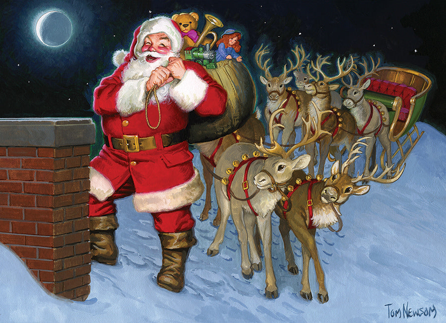 Cobble Hill - Santa Claus and his trusty reindeer have landed Up on the Rooftop and he's ready to head down the brick chimney with his bag full of toys for little girls and boys on Christmas. The snow top roof is no concern for his reindeer who will wait patiently under the moonlit sky. This 500 piece puzzle is a good challenge with the darker night sky and chimney.