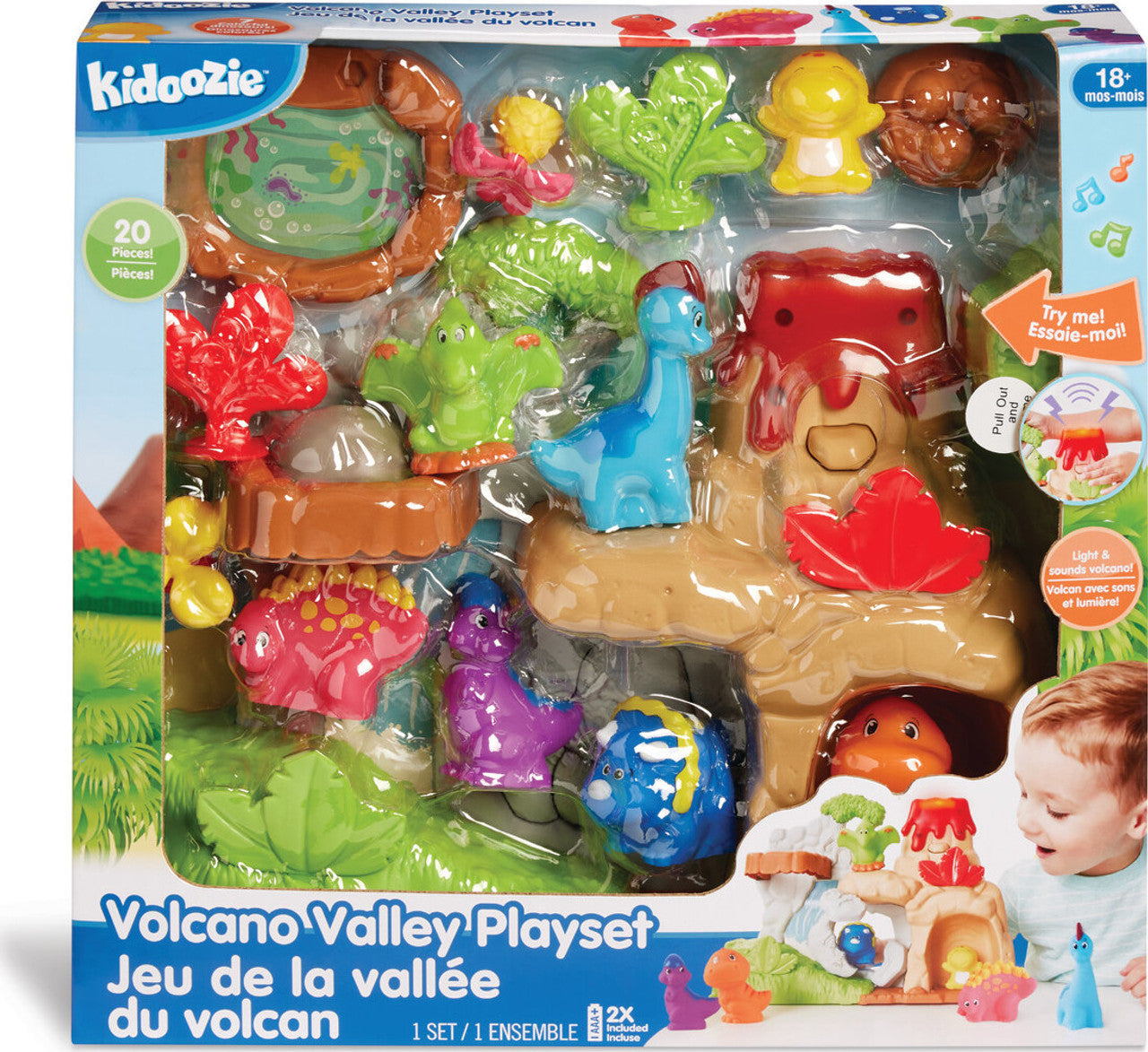 Kidoozie - Watch and listen to the volcano erupt as the dinosaurs roam around. 20 piece set including 7 dinosaurs, 2 boulders, 4 plants, dino mountain and much more. Features include break-through rocks, a boulder drop and a dino slide. Requires 2 "AAA" batteries (included).