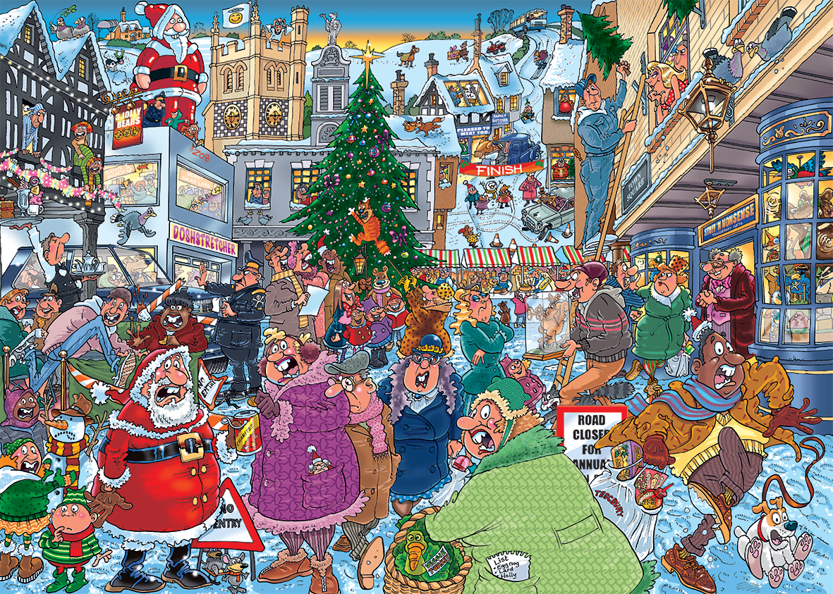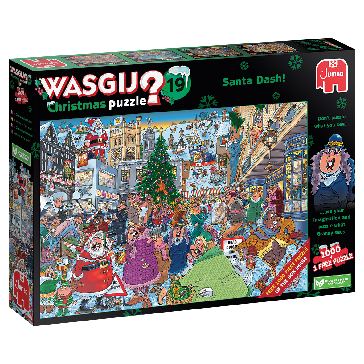 Jumbo - ‘Santa Dash!’ is the title of this festive Wasgij Christmas 19, 2 x 1000-piece jigsaw puzzle set. Christmas is approaching and the Upper Pigglington town square is bustling with shoppers picking up their last-minute gifts and enjoying the festivities. Some of the crowd can’t believe what they are seeing, but should they have been checking the signs instead of their shopping lists? What could Granny have spotted that has stunned the shoppers? That is the image you need to puzzle.Wasgij Christmas is the puzzle concept where you must use your imagination and clues provided to piece together not what you see on the box, but what the people on the box see!The finished size of each puzzle measures 68 x 49 cm (approximately), and the jigsaws have been produced using high-quality recycled board and precision die-cutting techniques to ensure every jigsaw piece maintains its original shape time and time again. With this release you’ll also receive an extra 1000-piece puzzle of the box image included absolutely free!So why is Wasgij so popular? With traditional jigsaws, you build the exact image that’s shown on the box. With Wasgij, you must build an image that’s different from that shown on the box. Although we give a few clues, Wasgij challenges you to use your imagination. Put that together with great drawings and pictorial humour, and it is no surprise that Wasgij has topped the jigsaw puzzle charts for so many years.