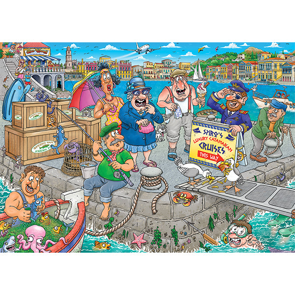 Jumbo - Grandma and Grandpa Wasgij are enjoying their long-awaited summer vacation! After months of planning and saving, they decided to treat themselves to a luxury catamaran cruise. The sun is shining and the bustling harbor is full of surprises, but as their long-awaited trip approaches, something has completely stunned them!